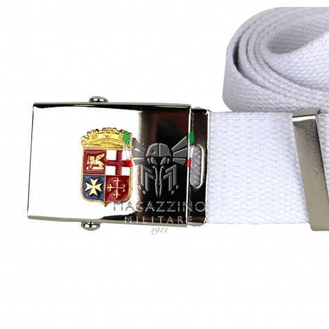 White hemp belt of the Italian Navy with republics emblem, adjustable up to a length of 120 cm. Polished metal buckle and raised enamel logo on the front.