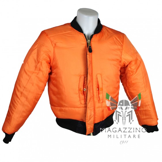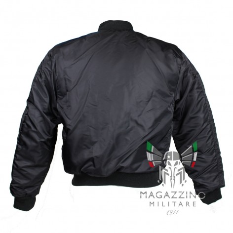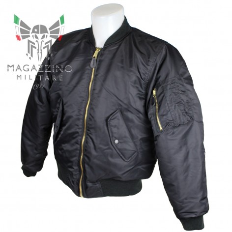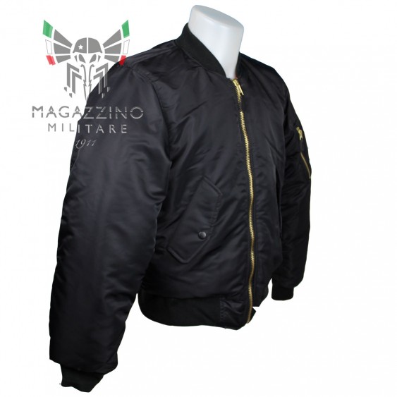The iconic MA1 Bomber, a timeless classic of military apparel, now in a sleek black version. It features the signature reversible orange lining, sleeve pocket, and sturdy golden zipper, combining authentic style and functionality.