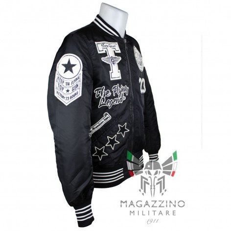 Original TOP GUN® men's bomber jacket in premium black nylon. Decorated with eye-catching "college" patches, it offers a timeless aviator look and weather resistance.