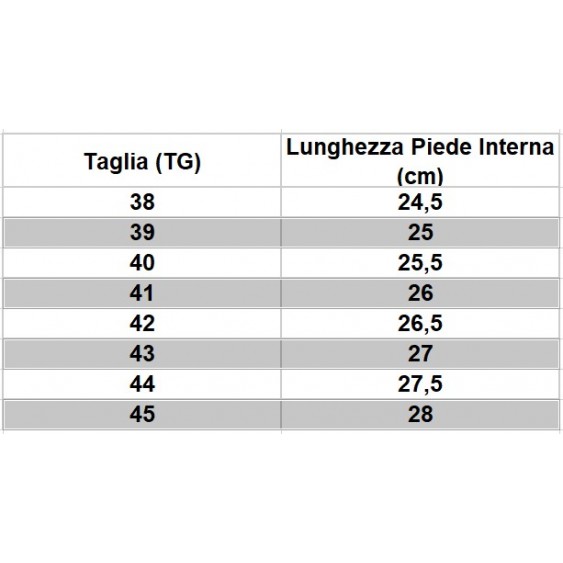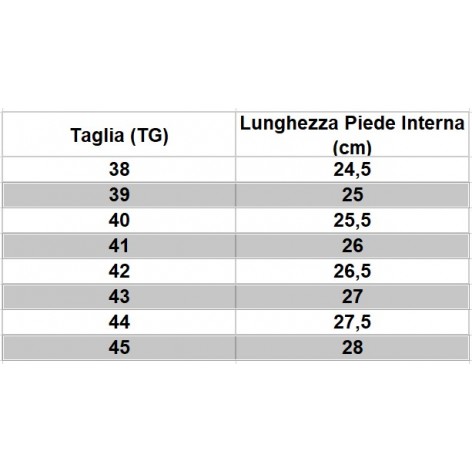 | Taglia (TG) | Lunghezza Piede Interna (cm) |