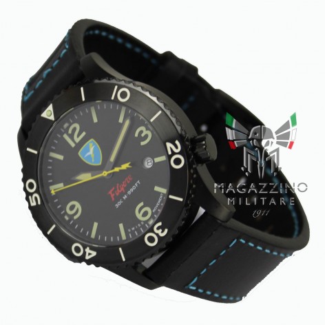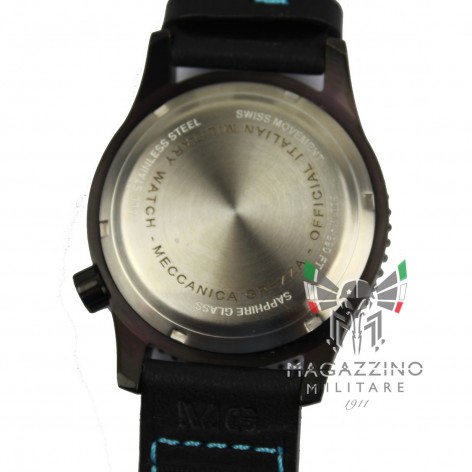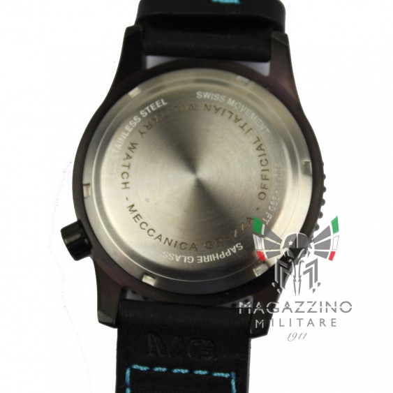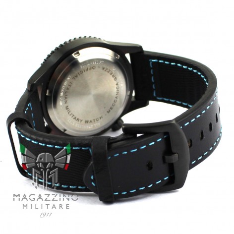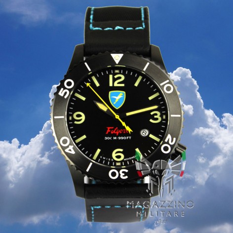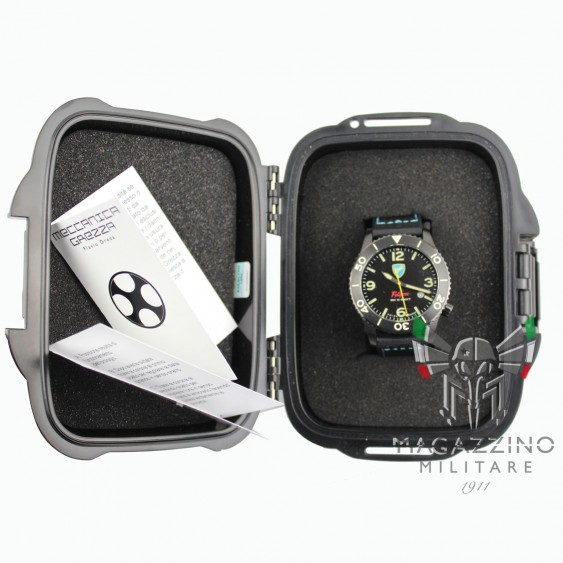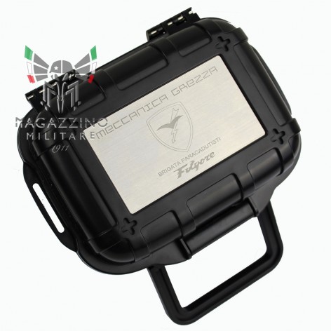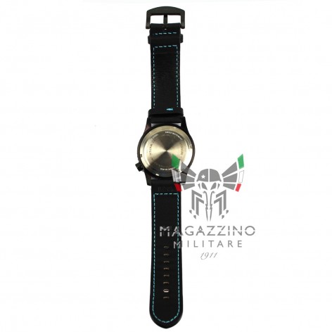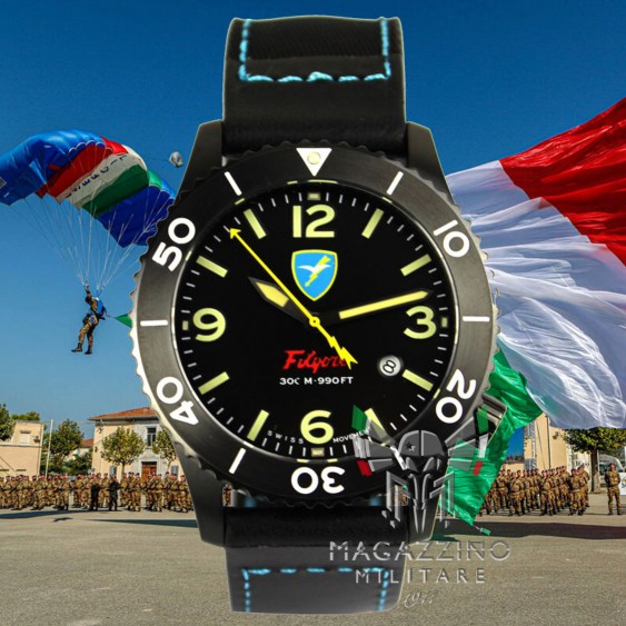 The Military Paratrooper Watch with Black PVD Case and Leather Strap is an official product of the Italian Army, produced by Mg Oreda under the official license of Defense and Services. This Nembo model features a Swiss Ronda 515 quartz movement, a 316L stainless steel case with PVD finish, a diameter of 42mm, and a thickness of 13mm. The anti-reflective sapphire crystal ensures scratch resistance and clear visibility, while the 30 ATM (300 meters) water resistance makes it suitable for diving. The 120-click unidirectional rotating bezel and technical water-repellent strap with 22mm lug complete the technical features of this watch. It comes in an official Folgore presentation box.