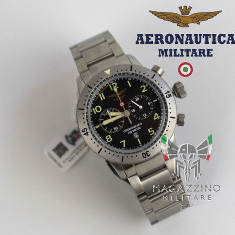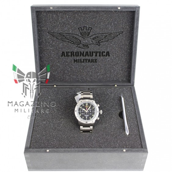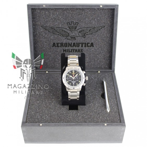 Elegant pilot chronograph watch, inspired by military history. Made with a steel case and band, a precise quartz movement, and water-resistant up to 100m.