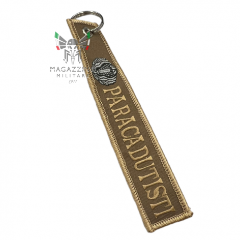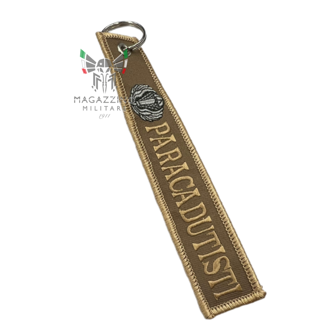 Portachiavi ricamato con scritta "PARACADUTISTI" su fondo sabbia, perfetto per accessori militari.